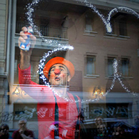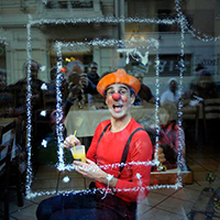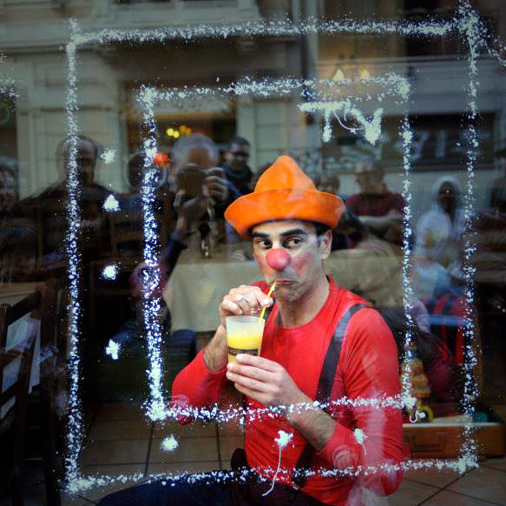 This Clown has it all, but is alone, stuck in his aquarium. Lives the solitude of the glass walls that set him from the real world. They hope to be able to convince passersby (the time of an orange juice) to join in his improvised orchestra that already has a musical flute and a birthday cake that sings.