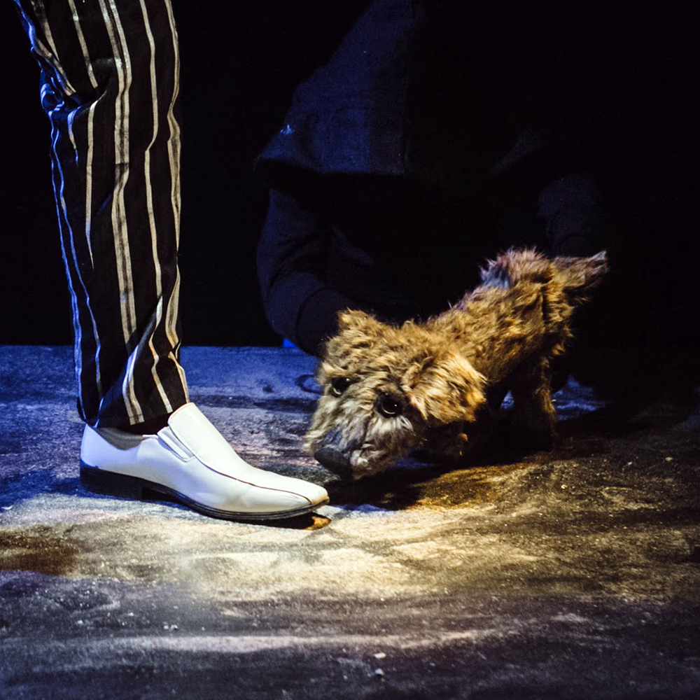 A play of puppetry and object theatre, where the curtain rises no more than necessary. Lost Dog enables the audience to share the point of view of the dog. Theatre without text, where emotions are expressed through the legs and feet of the actors.